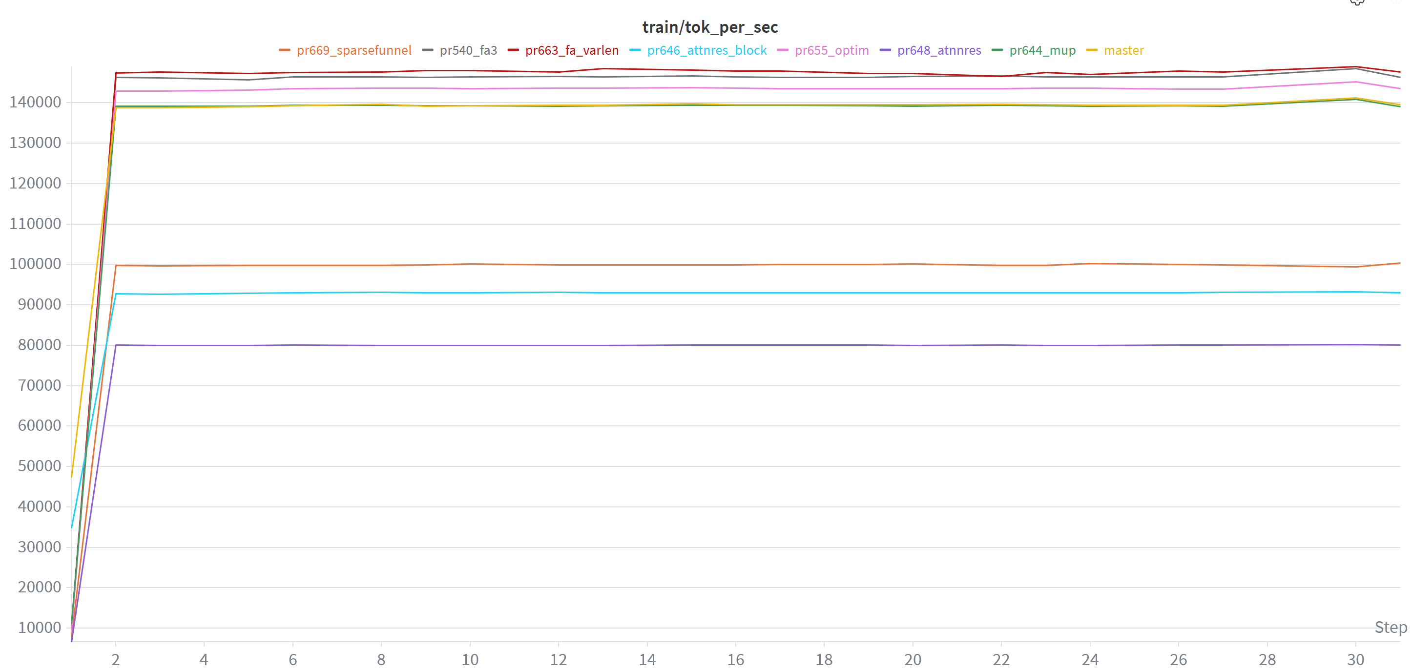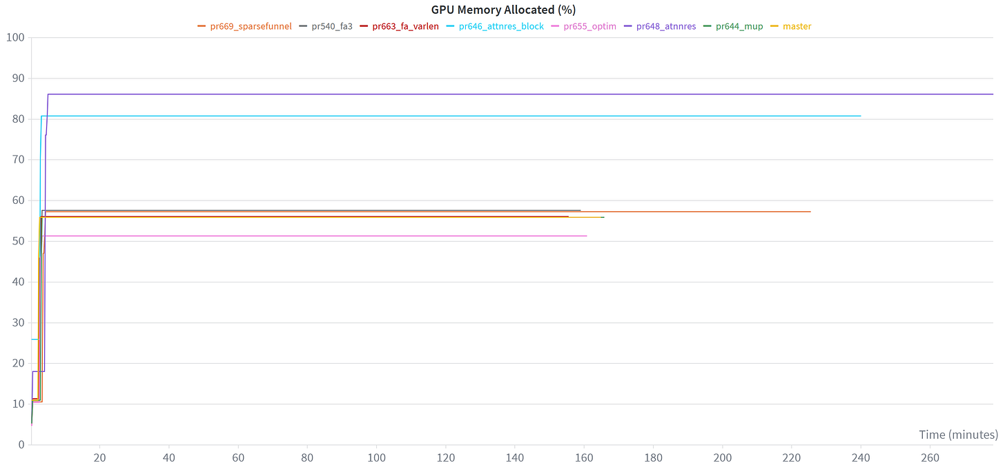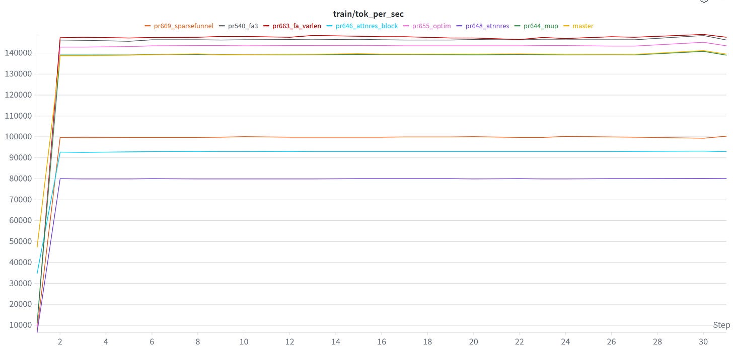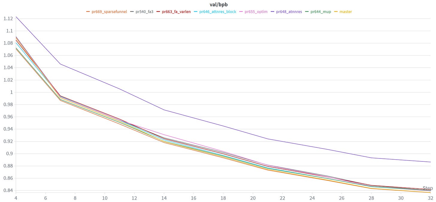 So one thing I’ve been doing to help assess user contributions that aim to improve nanochat’s pretraining code, is to do a quick sanity check on a (single) A100 instance I have access to. Using W&B, which is awesome for creating graphs you can spend all day looking at, I can then easily plot & compare different PR contributions: