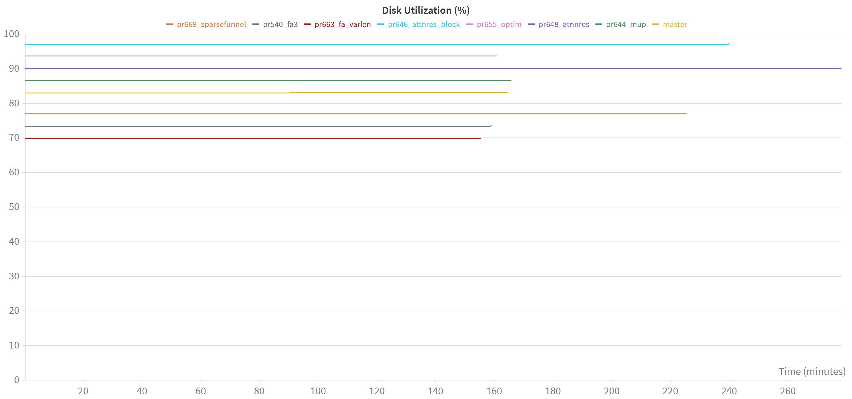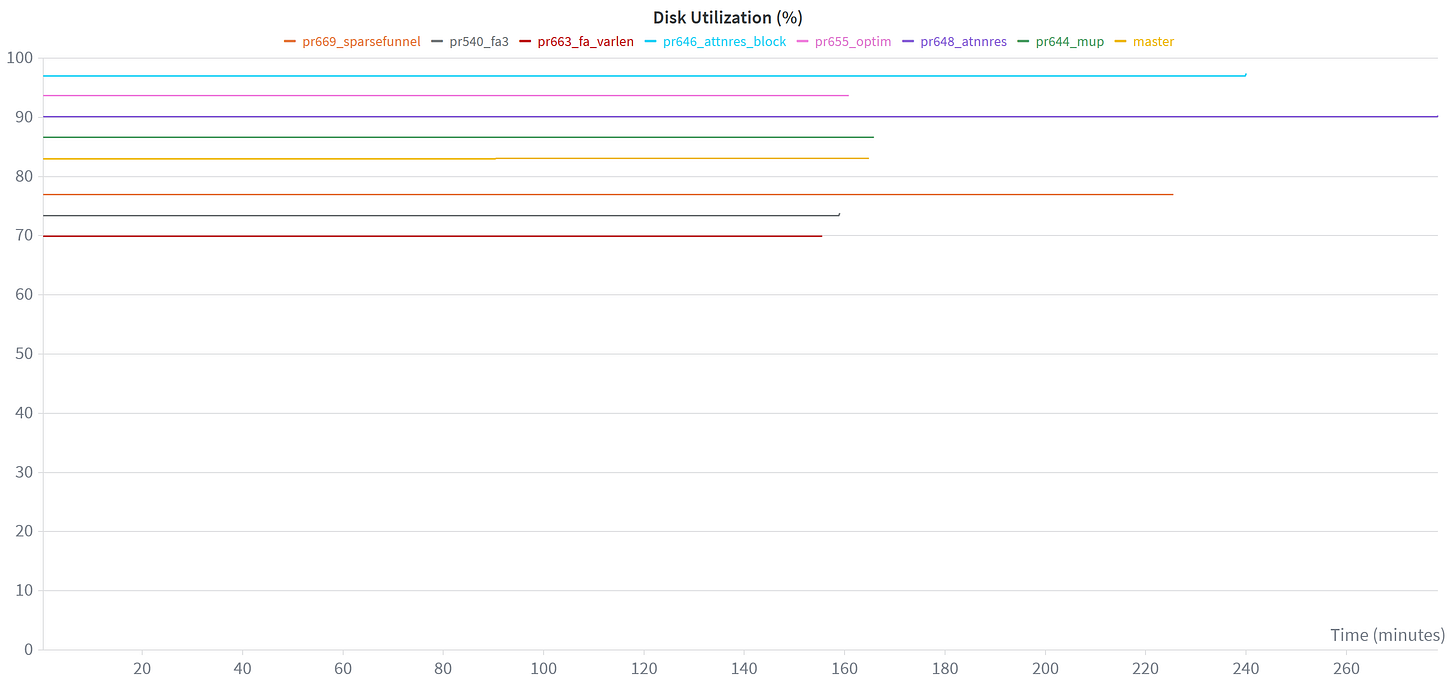 There’s many other interesting plots to look at, and all of these graphs are created automatically for you when you run the nanochat training scripts and are logged into W&B. For instance, it’s also really useful to check memory usage or disk utilization stats: