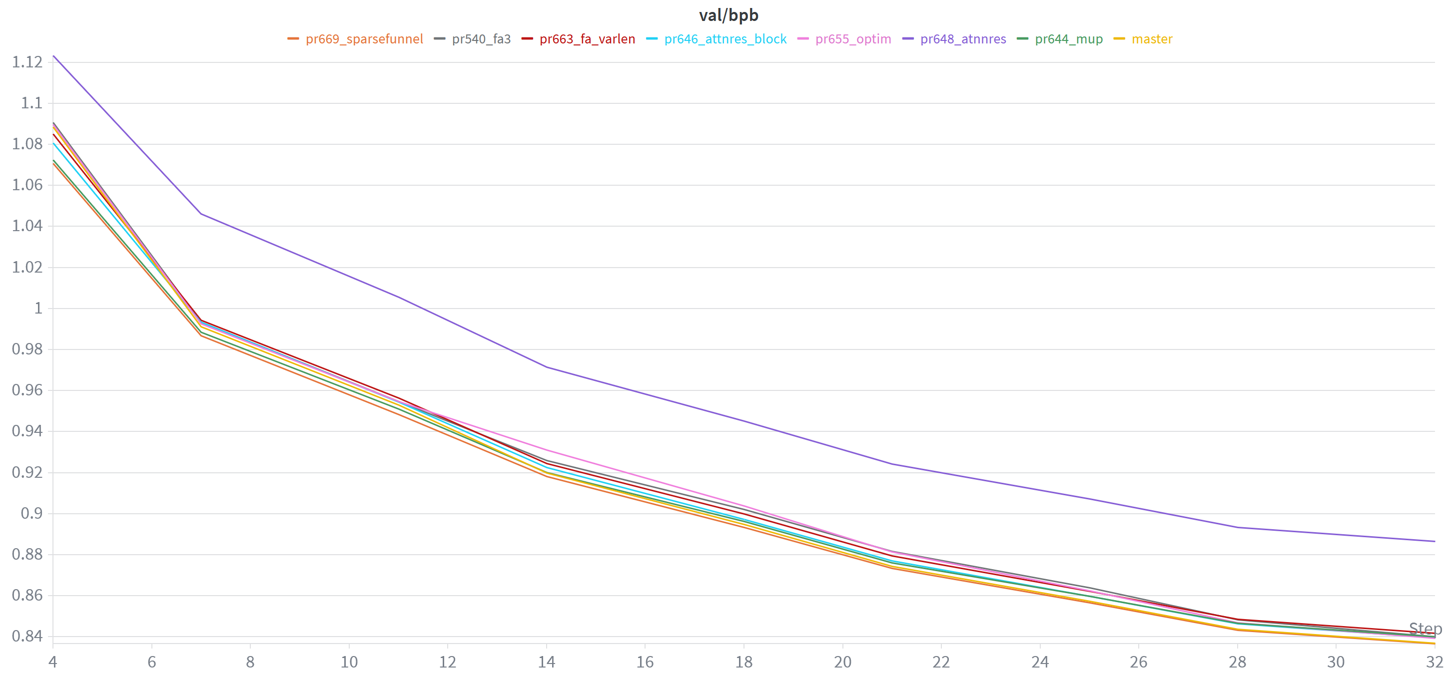 These are all d14 runs on an A100, and in terms of val_bpb, master still comes out on top at the end.